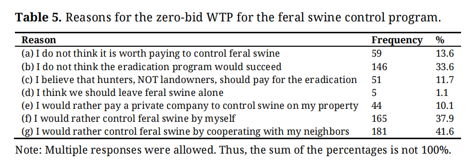 Table 5. Reasons for the zero-bid WTP for the feral swine control program.