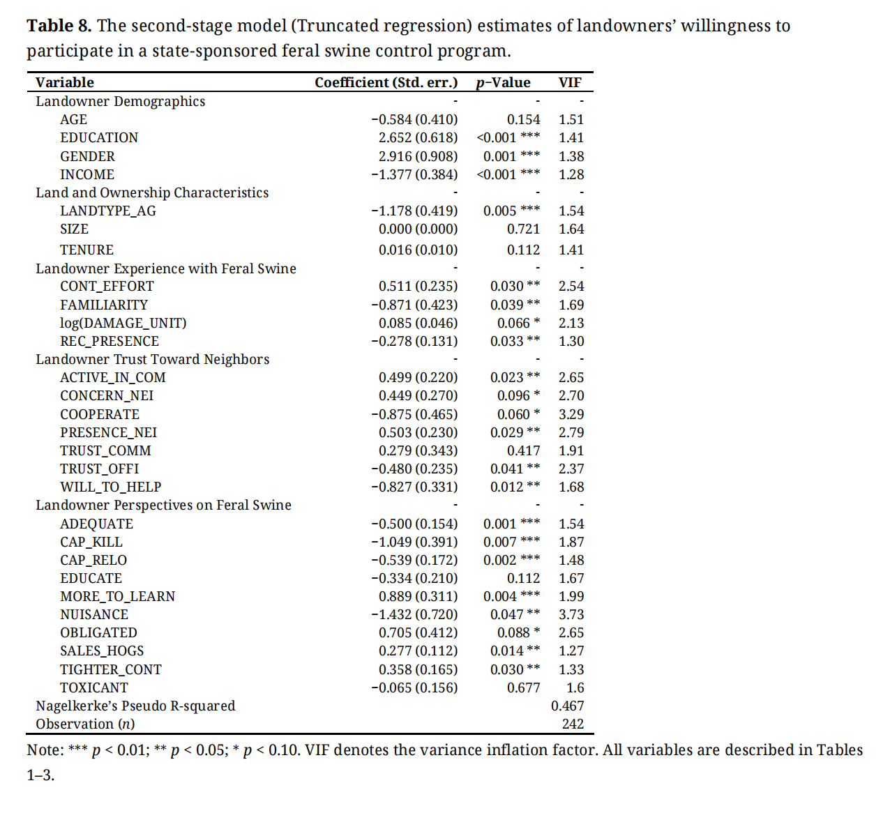 Table 8. The second-stage model (Truncated regression) estimates of landowners’ willingness to participate in a state-sponsored feral swine control program.