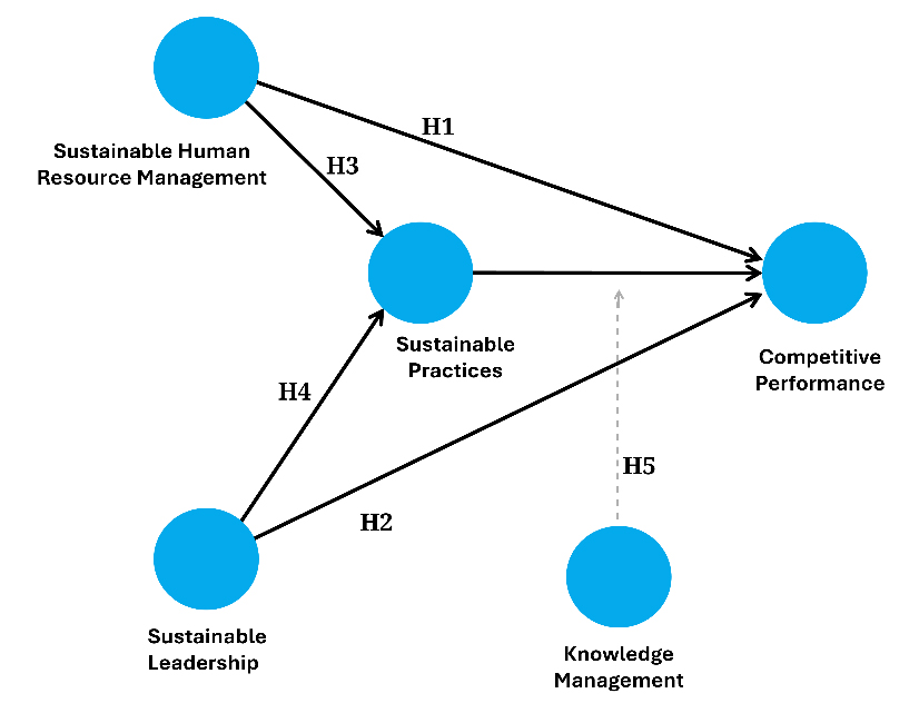 CP has been conceptualised as the capacity of organisations to mobilise internal and external resources in order to generate sustainable advantages in dynamic markets [11]. However, the literature acknowledges that the mechanisms through which SHRM and SL influence CP remain underexplored and require more integrative models [12]. Specifically, the inclusion of SP as mediating variables and KM as a moderator remains insufficiently developed, despite both constructs being essential to linking sustainability with innovation and competitiveness [13,14].