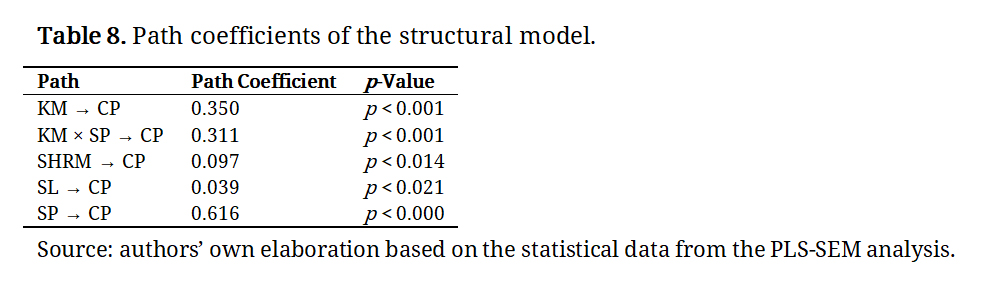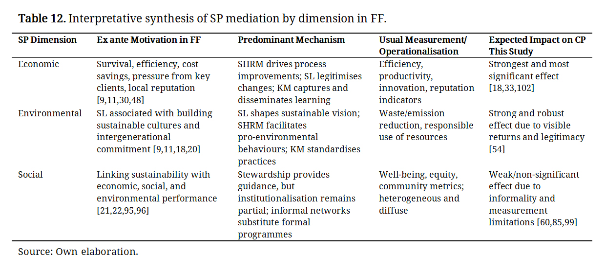 Beyond this core interaction, the model also incorporates SP and KM as mechanisms explaining how sustainability is operationalised and transformed into CP. In this way, the study offers a systemic view of how leadership, human capital, and organisational learning converge to strengthen the competitiveness of Colombian family coffee SMEs under a sustainability framework.