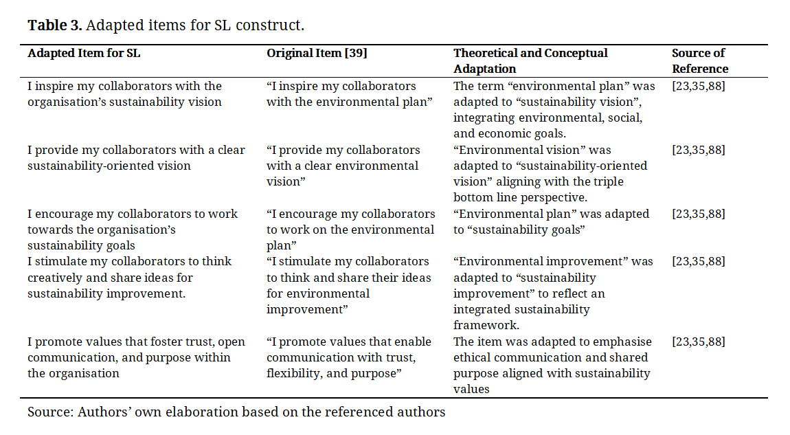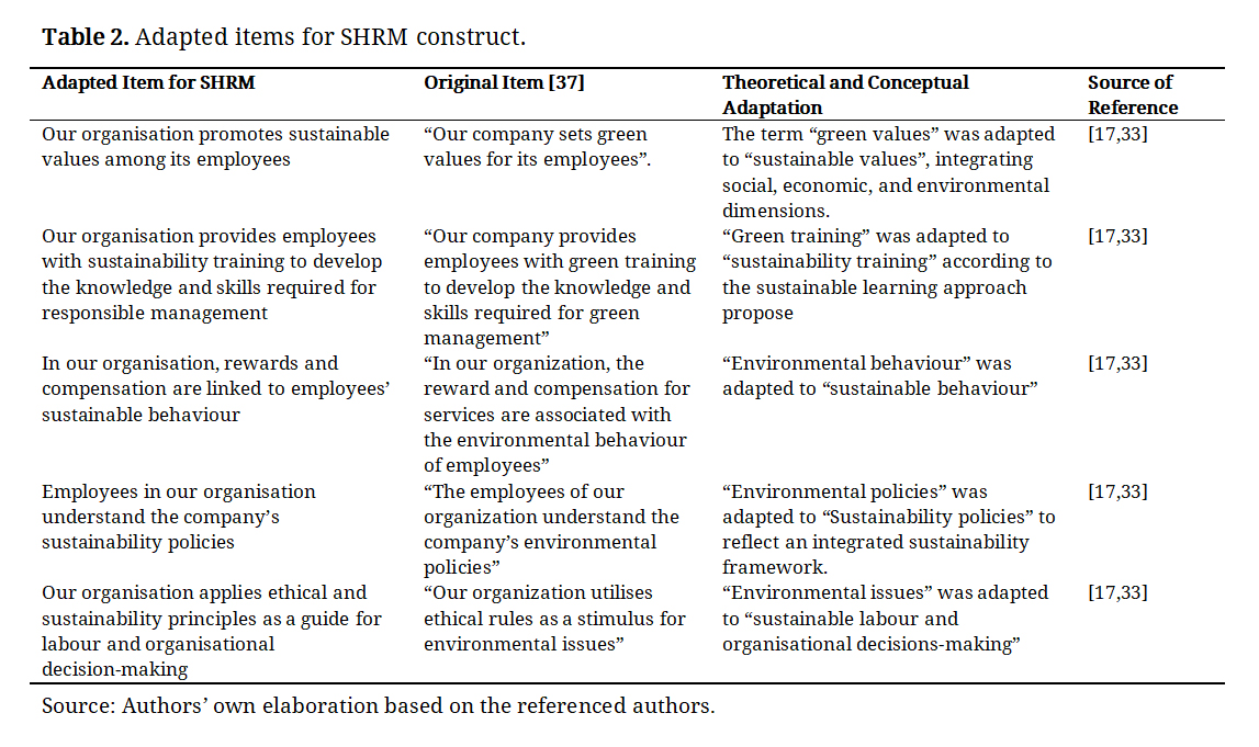 The original items from [37], corresponded to the Green Human Resource Management (GHRM) scale; however, in the present study, they were adapted towards a more integrative SHRM approach, replacing the exclusively environmental emphasis with a broader and more holistic understanding of organisational sustainability, consistent with the theoretical orientations of [17,33]. The adaptations made and the final items included in the instrument are presented in Table 2.