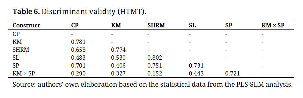 Accordingly, a gap persists in understanding how SP mediate these relationships and how KM strengthens or weakens their impact in organisations highly dependent on local human and social capital. In response to these limitations, Table 1 summarises the main theoretical gaps identified in the literature, the specific contributions of this study, and their correspondence with the research hypotheses (H1-H5), ensuring coherence between the theoretical framework, the identified gaps, and the proposed model.