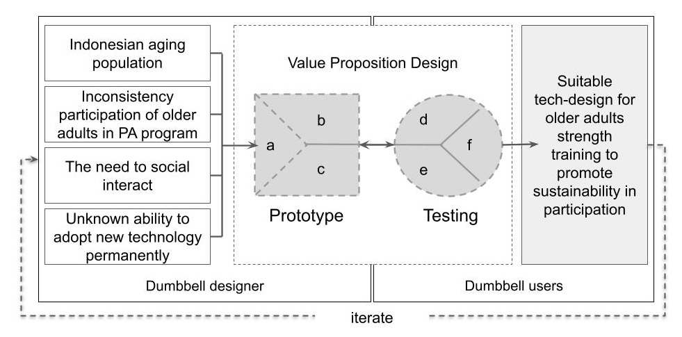 The rapidly aging population of Indonesia is facing different challenges in sustaining regular physical activity, specifically in strength training, due to low adherence and limited opportunities for social engagement. Therefore, this research aimed to develop and evaluate the first prototype for older adults, using Osterwalder’s Value Proposition in combination with Design Thinking to guide iterative development. A 28-day field trial was conducted with 40 active, retired participants aged 60 to 82, focusing on the feasibility of upper limb strength training through group-based technology-assisted exercise. The participant experiences were collected qualitatively through individual interviews and analyzed thematically according to the Value Proposition Design (VPD) framework. The results showed that participants more readily articulated perceived benefits, such as enhanced social connection and opportunities for muscle training than barriers including reluctance or discomfort. Even though direct simultaneous exercise was limited by personal routines, the sense of connectedness was highly valued. Moreover, technology-facilitated group exercise devices were well-received by older adults when clear benefits were communicated, reporting the potential to enhance health-conscious communities and improve physical and social well-being. Future research could show the types and degrees of social interaction that most effectively promoted ongoing participation in physical activity among older adults.