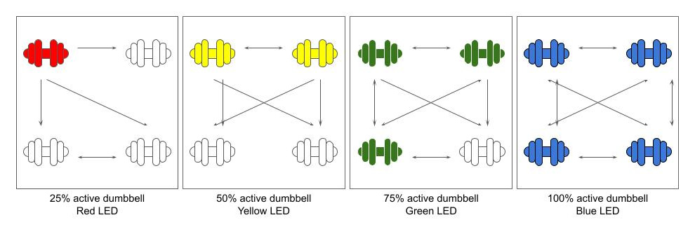 DeviceThe first prototype represents the identification of the demands of older adults who wish to exercise together while also extending the duration of the activity. The shape of the tool is similar to conventional sports equipment used to train hand muscle strength, with an elliptical handle form and a diameter of no more than 43 mm [33]. The complete design prototype weighs one kilogram, as adhere to the majority of the older adult’s talents measured [34]. Embedded technology offered by the prototype is in the form of an invitation to exercise with an arbitrary LED light configuration. Radiant LED lights of different units were switched on in different color to support the need for ‘feeling connected’ among fellow participants. The arrangement of LED color is provided in Figure 2. Before the experiment, participants were instructed on the meaning of the LED color. The motivation to exercise is affected when the lights show a greater number of individuals exercising.
