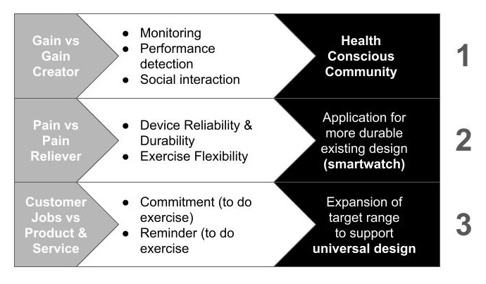 Product and Service vs Customer Jobs: Convey the Main Benefit from ‘Exercise Together’ to ‘Reminder to Performed’The commitment to ‘learn to use the equipment’ and ‘perform exercise’ is acknowledged as a personal motivator even though the initial capacity or ability varies. The opportunity to socialize and contribute to the community seemed interesting but was not more important than regular work. Participants could not immediately participate in exercising despite figuring out there was an active group. An invitation to exercise together for the older adult who had routines was unable to convince the participants to leave or change schedule. Therefore, the promise of rewards for exercising is in the form of ‘reminder to perform’.