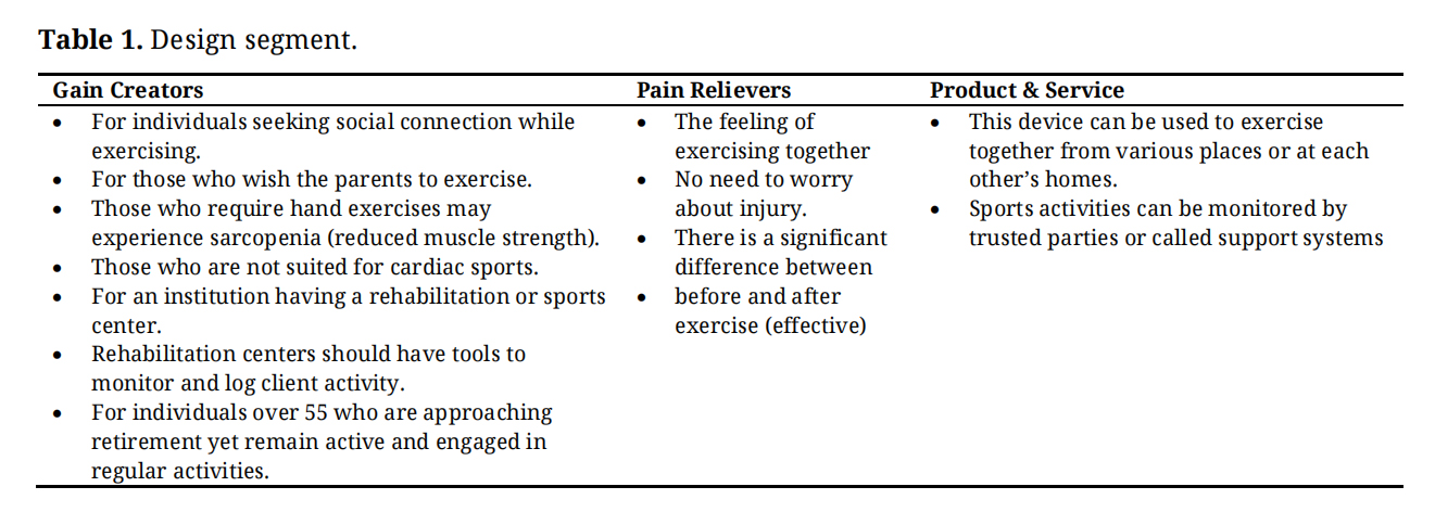 Based on the new formulation of the value proposition and potential customers, the benefits communicated are the offering of a product that provides a practical experience in strengthening activities. This provides the opportunity to improve understanding and join a community concerned about health. The design [40] serves as a bridge to well-being through physical activity instead of being marketed only as a “technology-driven product”. Older adults known as Prensky’s digital wisdom can determine the methods to overcome technical challenges, as evidenced by the adept use of appropriate technology in maintaining social connectivity, reducing loneliness, and mastering new media technologies [41].