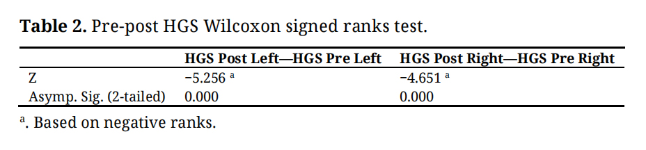 The first prototype effectively increased HGS. In this context, Wilcoxon signed-rank test result showed a significant difference (provided in Table 2) for both left and right hand between pre-and post-condition of participants using American Society of Hand Therapists protocol [36]. The Cohen’s medium effect size [37] reported 0.59 and 0.52 for left and right hands, respectively.