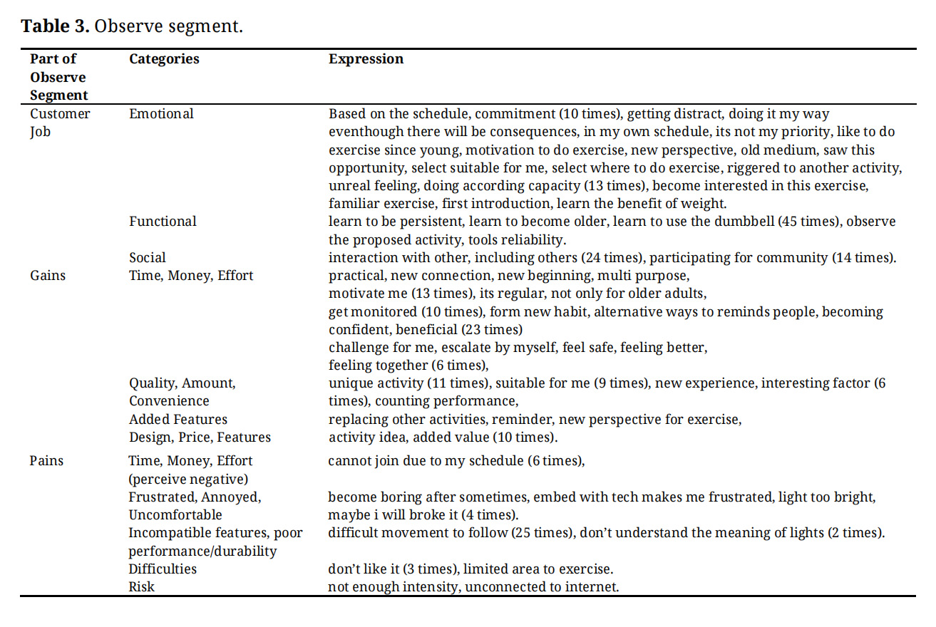 Customer job categories include “learning to use tools” (45 times), “including others” (24 times), “thinking about where to exercise” (23 times), “interacting with others” (21 times), “participating in the community” (14 times), “doing according to one’s own capacity” (13 times), “commitment” (10 times). Participants also reported mixed perceptions of the activity as an opportunity and showed the suitability due to familiarity. Meanwhile, others expressed negative sentiments such as “this activity is not my priority,” “I prefer other activities,” “I get bored after doing it for a long time,” and “I tend to get distracted by other tasks while exercising. Total expression related to customer jobs answers consisted of 249 expressions.