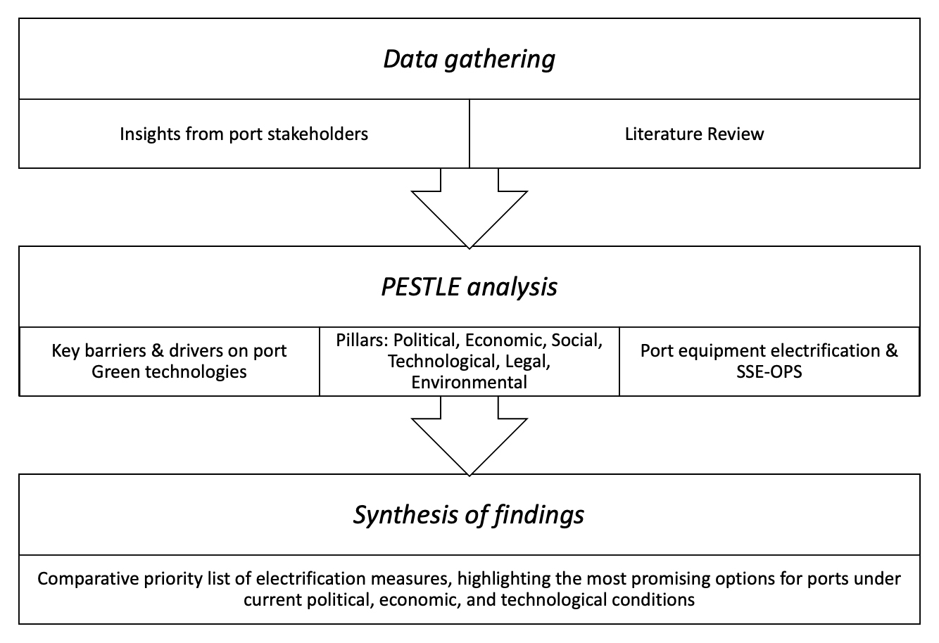 As illustrated in Figure 1, the analytical process starts with the gathering of evidence from two main sources: secondary data from port stakeholders and a structured literature review. These feed into the PESTLE analysis, which highlights the various contextual forces shaping electrification efforts. The final step involves synthesising the findings to extract strategic assessment criteria that can guide practical implementation.