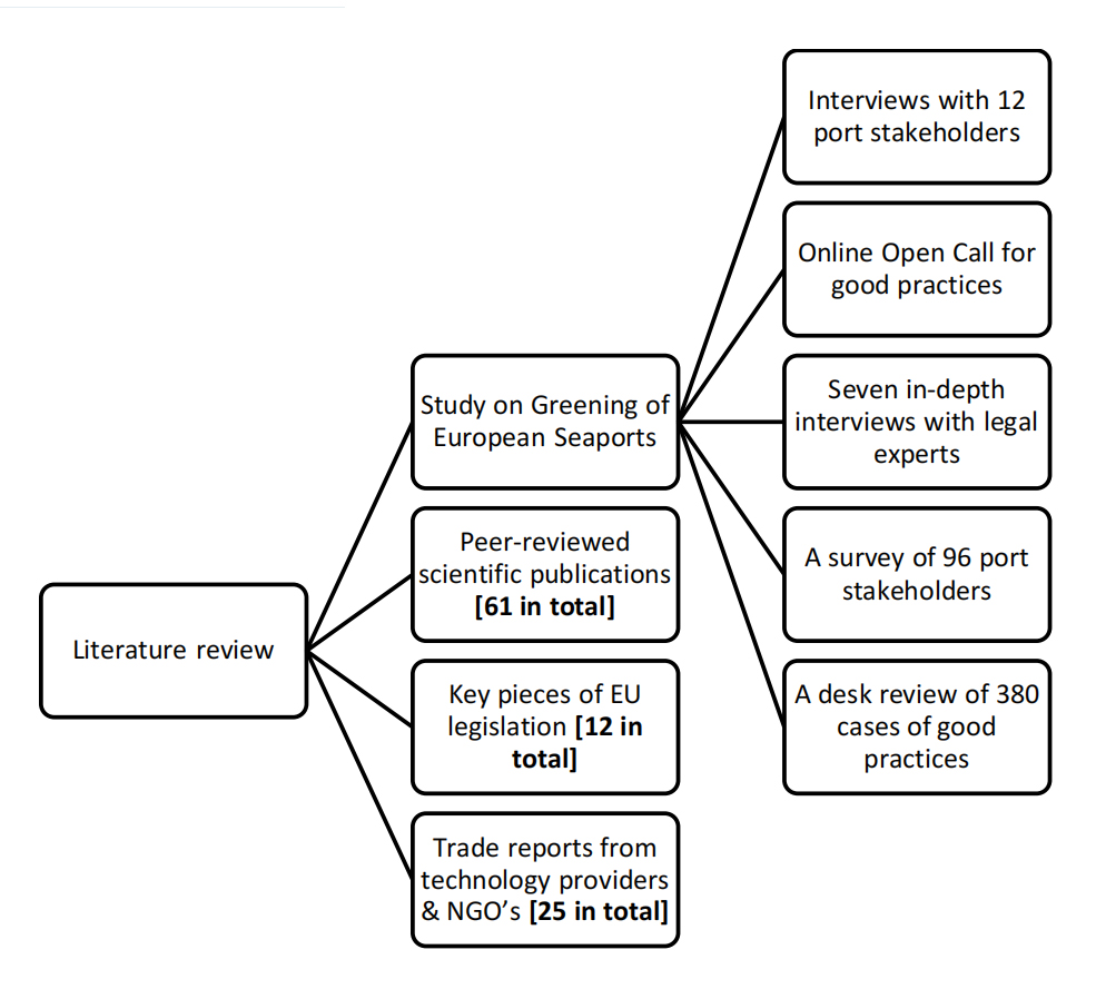 The literature review draws on over 60 peer-reviewed academic articles, 25 technical reports from technology providers and NGOs, and 12 EU legislative texts (Figure 2). Among these, the EU-commissioned “Greening of EU Ports” study [6], plays a central role. It offers valuable data through a mix of interviews with 12 port stakeholders, seven in-depth interviews with legal experts, a survey of 96 port representatives, and a desk review of 380 good practice cases. This extensive evidence base provides insights into real-world implementation challenges, legal ambiguities, and institutional dynamics relevant to electrification.