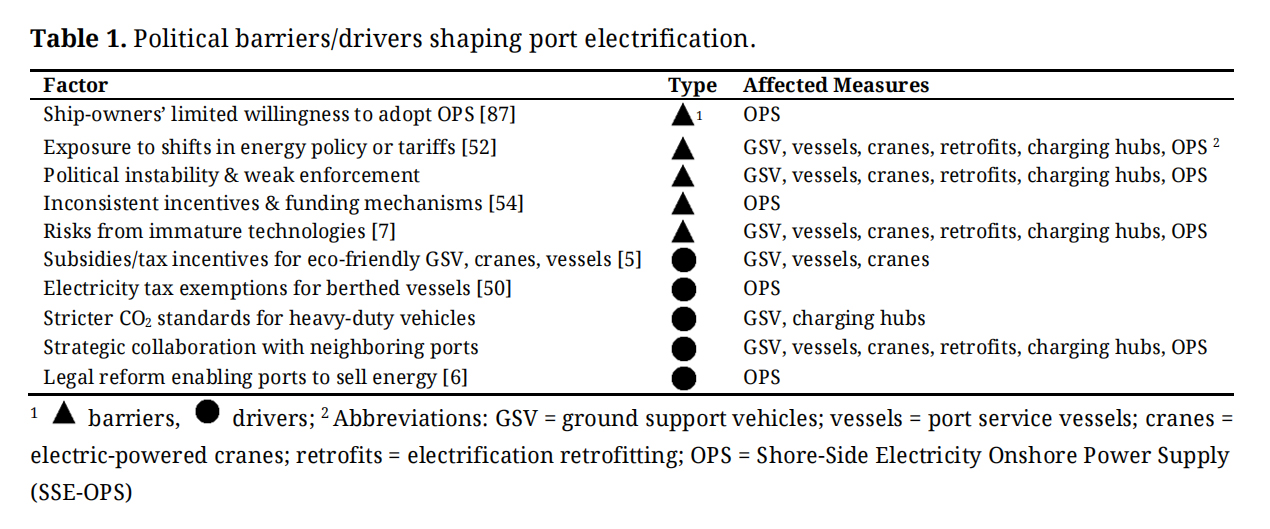 Table 1. Political barriers/drivers shaping port electrification.