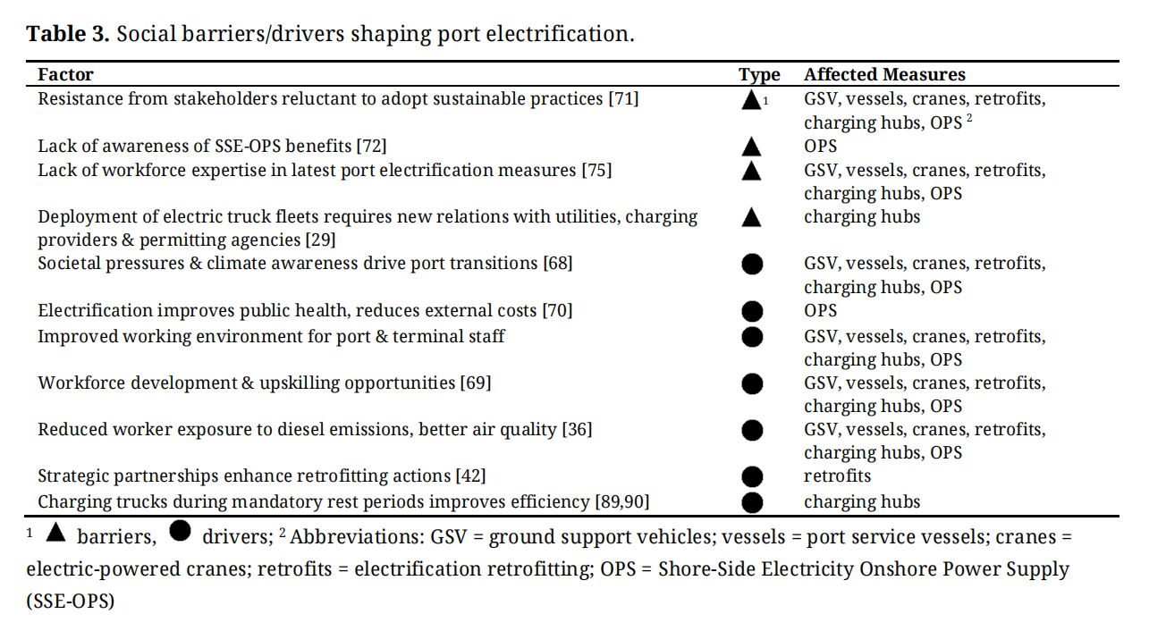 Ultimately, while social drivers such as improved health, local employment, and public support offer a compelling case for electrification, challenges like resistance to change and skill shortages require proactive management. Addressing these barriers will require sustained stakeholder engagement, communication strategies, and workforce training to ensure a smooth and inclusive transition to electrified port operations.