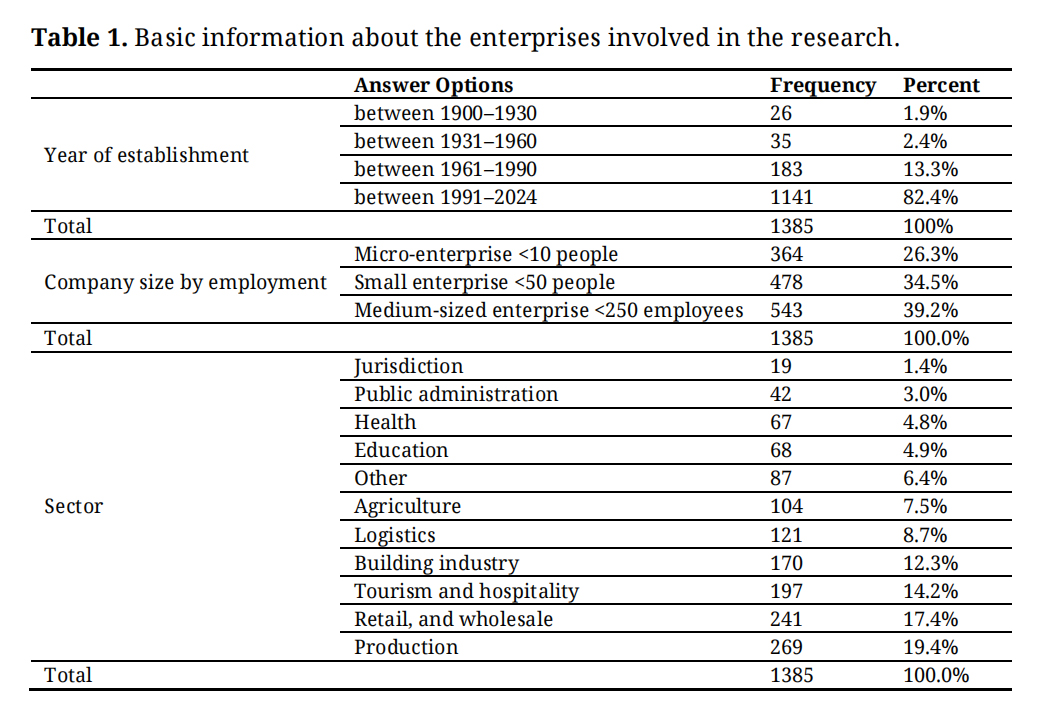 Table 1 presents some basic information about the companies that participated in the empirical research. Based on the year of establishment, we created four groups: 82.4% of the companies were founded between 1991 and 2024; 13.4% between 1961 and 1990; 2.4% between 1931 and 1960; and 1.9% between 1900 and 1930. Since the research specifically focuses on the SMEs, we categorized companies into three groups according to company size based on employment: 39.2% were medium-sized enterprises, 34.5% were small enterprises, and 26.3% were micro-enterprises. In terms of industry classification, 19.4% of the companies operate in manufacturing, 17.4% in wholesale and retail trade, 14.2% in tourism and hospitality, and 12.3% in construction. Additional sectors presented in the table appear with a share below 10%.