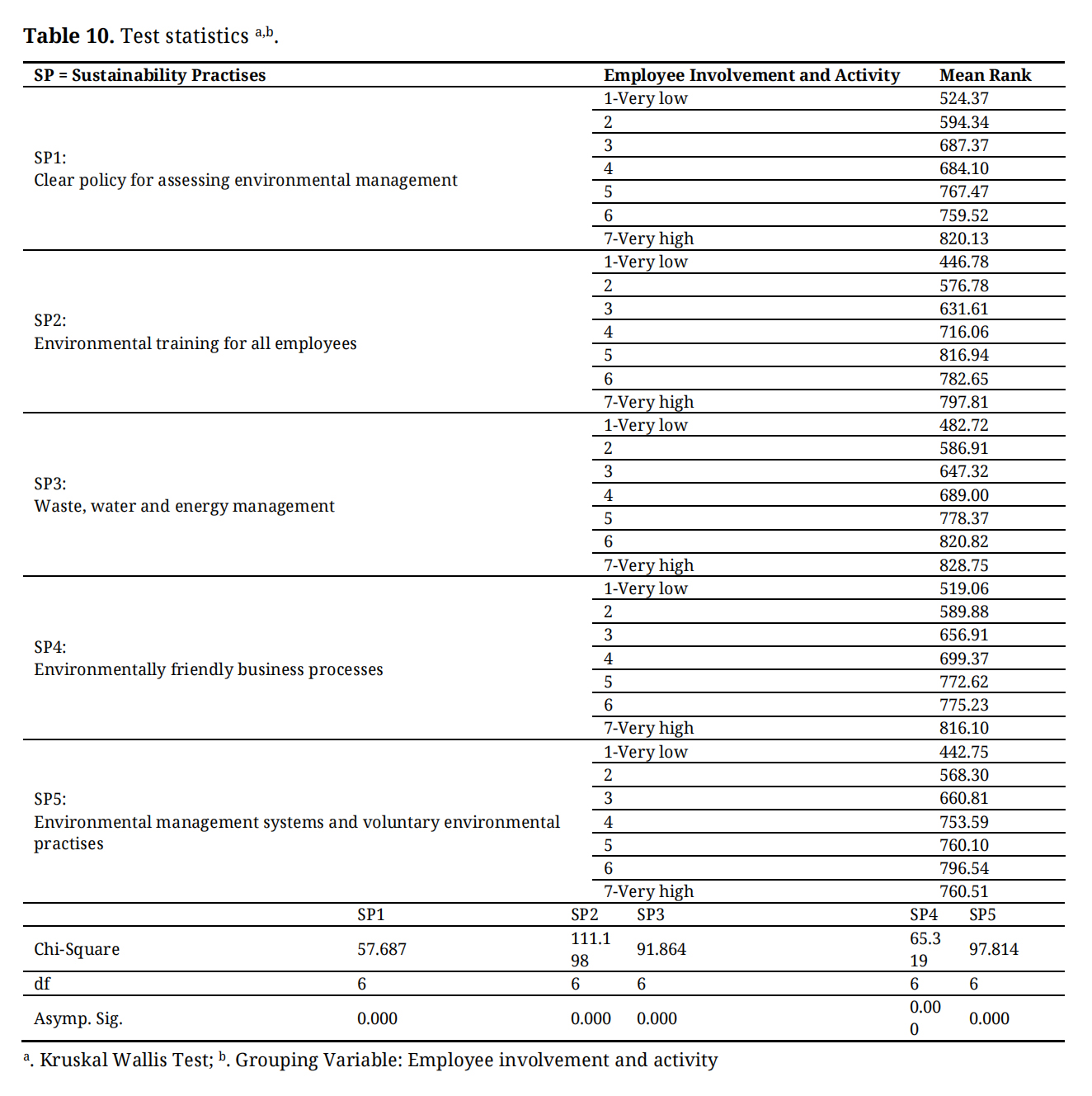 Table 10 presents the test of the H5 hypothesis. There were no obstacles to conducting the hypothesis test, as all necessary conditions were met. The aim of testing the H5 was to determine the what extent the effectiveness of innovative sustainability practices in SMEs differs based on employee involvement. Differences were analyzed between the innovative sustainability practices (SP1, SP2, SP3, SP4, SP5) as dependent, grouping variables and employee involvement as the independent variable.