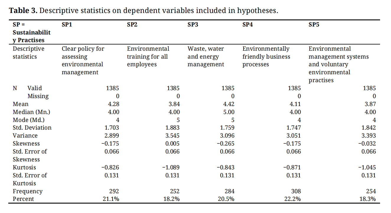 Table 3 presents the descriptive statistical analysis of the independent variables underlying the hypotheses. Among the surveyed SMEs, 21.1% (Md. = 4; Mn. = 4) moderately agreed that their company has a clear policy for assessing environmental management. Additionally, 18.2% (Md. = 4; Mn. = 3.84) similarly moderately agreed that the company provides environmental training opportunities for all employees. A significant proportion, 20.5% (Md. = 5; Mn. = 4.42), strongly agreed that their company conducts effective waste, water, and energy management activities. Furthermore, 22.2% (Md. = 4; Mn. = 4.11) reported having environmentally friendly business processes, while 18.3% (Md. = 4; Mn. = 3.87) indicated that their company has its own environmental management system and environmental practises.