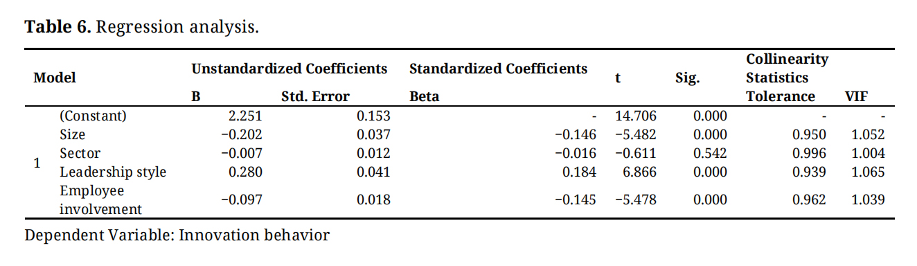 Table 6 presents the results of the regression analysis in relation to the main Hypothesis H1. Based on the regression analysis, at a significance level of p = 0.000 < 0.05, company size, leadership style and employee involvement have a significant effect on the innovation behaviour of companies. In the case of company size (β = −0.146; B = −0.202) it can be stated that the smaller the company, the less active the company is in terms of innovation. In the case of leadership style (β = 0.184; B = 0.280) it can be stated that the more prominent the leadership style, the more active the companies are in terms of innovation. In the case of employee involvement (β = −0.145; B = −0.97), it can be stated that the less employees are involved, the less active the company is in terms of innovation.