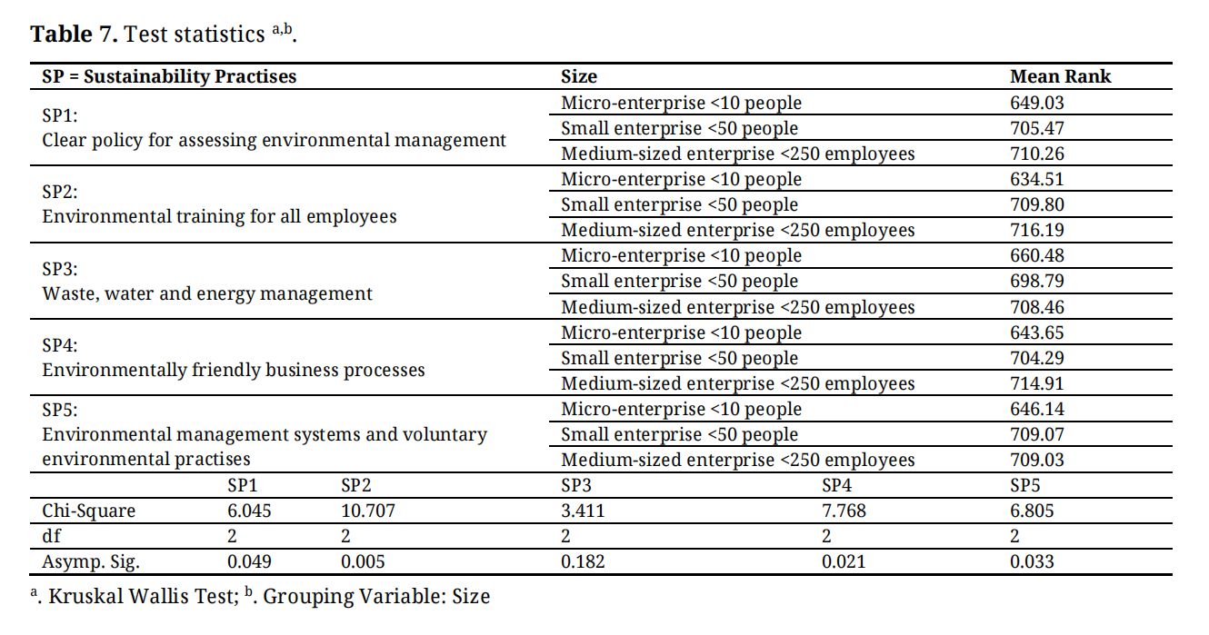 Table 7 presents the test of the H3 hypothesis. There were no obstacles to conducting the hypothesis test, as all necessary conditions were met. The aim of testing hypothesis H3 was to determine to what extent the effectiveness of innovative sustainability practices applied in SMEs differs based on the company size. Differences were analysed between the innovative sustainability practises (SP1, SP2, SP3, SP4, SP5) as dependent, grouping variables and company size as the independent variable. There is a significant difference between the company size applied in SMEs and all innovative sustainability practises except one (SP3: χ² = 3.411, df = 2; p = 0.182), at a significance level of p = 0.000 < 0.05. This suggests, that waste, water and energy management are equally important regardless of company size. The effectiveness of innovative sustainability practises applied in the surveyed SMEs are linked to the company size to varying degrees. Comparing the rankings, it was found that, with one exception, the effective implementation of all innovative sustainability practices differs based on the company size. As a post hoc test, was used Mann-Whitney u test to detect which groups had significant differences based on sustainability practices. Since N = 1385 > N = 30, was used a Z-approximation when evaluating the statistical test. In the case of SP1, there was a significant difference between micro and small enterprises (Z = −2.035; p = 0.042), and micro and medium-sized enterprises (Z = −2.312; p = 0.021). In the case of SP2, there was a significant difference between micro and small enterprises (Z = −2.772; p = 0.006), and micro and medium-sized enterprises (Z = −3.020; p = 0.003). In the case of SP4, there was a significant difference between micro and small enterprises (Z = −2.162; p = 0.031). In the case of SP5, there was a significant difference between micro and small enterprises (Z = −2.249; p = 0.024), and micro and medium-sized enterprises (Z = −2.386; p = 0.017). Hypothesis H3 was confirmed, meaning that there is a difference between Hungarian SMEs in terms of sustainability practices depending on the size of the company.