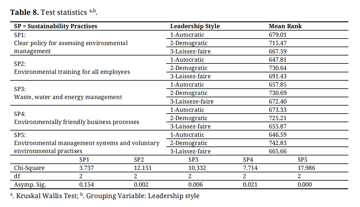 Hypothesis (H4). Companies differ in the application of sustainability practices based on leadership style.