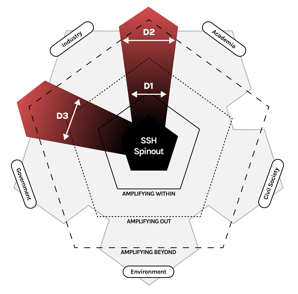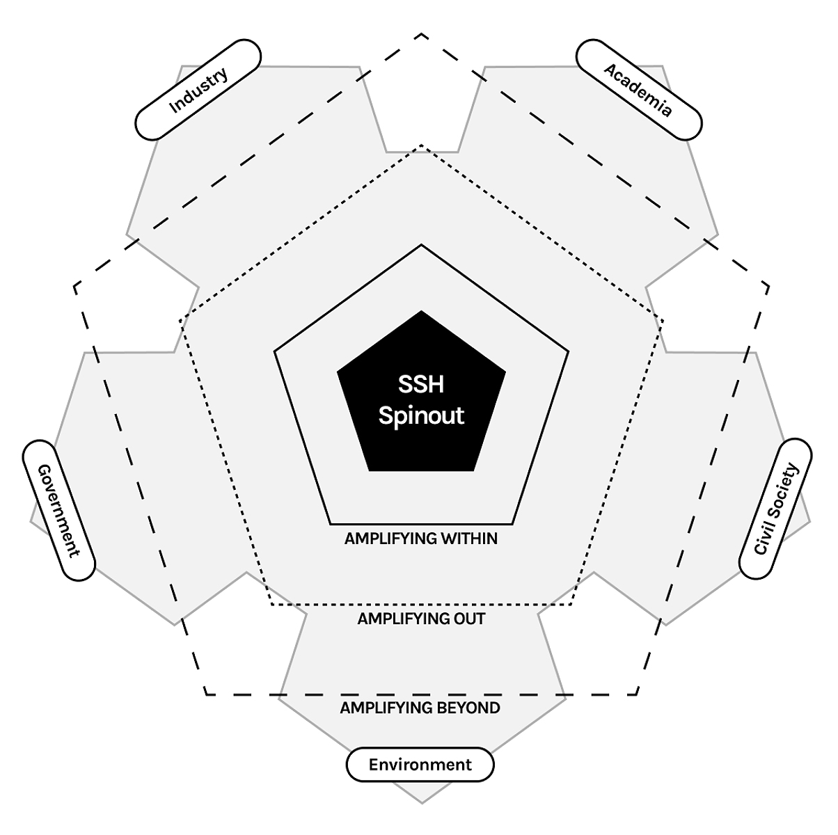 Amplification Patterns in Early DevelopmentThe case illustrates how an SSH-based spinout’s early development involved multiple, interacting forms of scaling. Analysed through the three amplification dimensions proposed by Lam et al. [14]—amplifying within, amplifying out, and amplifying beyond—these processes shaped both the organisation’s internal consolidation and its positioning within emerging policy and innovation networks.