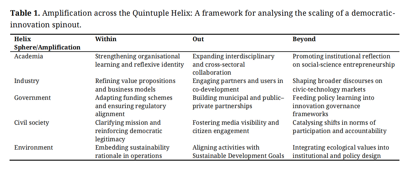 Understanding how democratic innovations evolve from academic research into actionable, real-world initiatives requires clarifying the analytical lenses that guide our analysis. Although this paper draws on a single case, its ambition is explanatory rather than descriptive: to show how ideas rooted in the social sciences can scale into new organisational forms and influence institutional ecosystems. We combine two complementary perspectives from sustainability-transitions and innovations-studies scholarship: the amplification framework [14], which explains how innovations scale internally, externally, and systemically, and the Quintuple Helix model [2], which maps the institutional environments shaping interactions among academia, industry, government, civil society, and the natural environment.