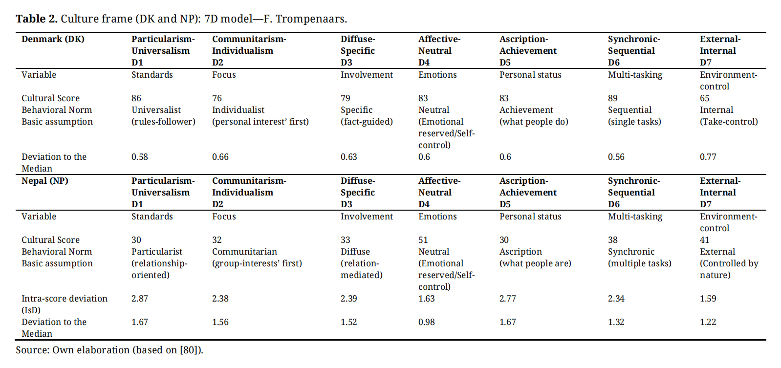Hence, cross-analyzing these model-specific benchmarks, one triangulated the intra-model cultural frames’ scores. In the table above, it is shown firstly a triangulation of 3 dimensions of the 7D model which are directly comparable with 3 other dimensions of the 6D model, as they are centered on equivalent variables of analyzability: focus (Foc); personal status (PSt); and environment-control (EnC). The results of such intra-model deviation (ImD) denote, markedly, a higher degree of consistency in NP figures than in DK ones. Besides, the variations found in DK to PSt (D5~D3) and EnC (D7~D4) unveil seminal differences of parametrization swiftly explored in this paragraph. The variable PSt at the 7D model classifies Danes as “achievers” while the 6D as “consensus” seekers ([80], Cultural Factor, online), holding their results diametrically different results. The explanation for such discrepancy in data resides on the parametrization of the 7D as to the focus on specific tasks, information and work (“what to do”), versus a 6D model with parametrization centered on societal structure and dynamics and quality of life which achievement represents, equality (societal structure), solidarity (in social dynamics) and quality of life the notion of “work-life balance”. Hence, it is also arguable that the perception of consensus in 6D is consistent with the perception of achievement in the 7D model, as the perception of a successful realization (achievement) of a structure of society and quality of life.