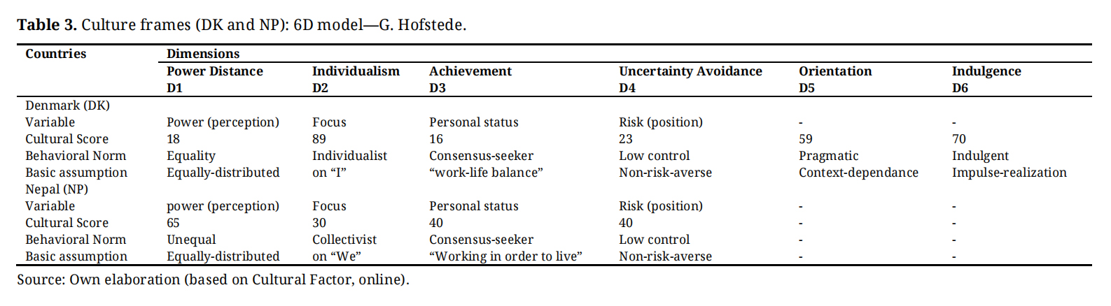 One has analyzed a dyad of secondary data sources. Firstly, we have explored the cultural frames of the case-firm’s country, Denmark (DK) against the respondents’ country of Nepal (NP), by crunching the metrics of their cultural scores to achieve a solid foundation of behavioral assumptions/beliefs of both nations.