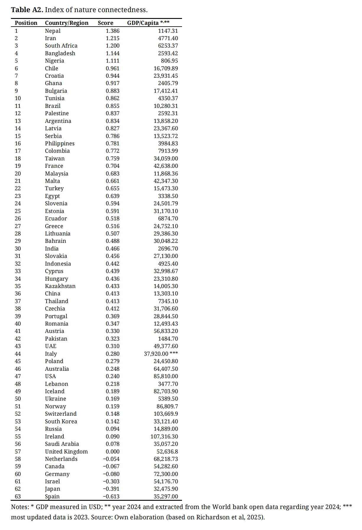 Hence, to confirm the inverse proportionality of high environmental protection (aka resistance) and lower economic growth also advocated by Eckersley (2000) [85] one cross-observed furthermore the results of the IoNC against the World Bank Open Data for one macroeconomic indicator (i.e., GDP per capita)—see Appendices Table A2 and Figure A1. The correlation of the index scores of nature connectedness with GDP, confirmed a negative function, with the focal country (Nepal) appearing precisely at the top of such ranking (1st place out of 61 countries) but almost at the bottom of the used economic indicator, uncovering a clear unbalance of environment protection and economic growth in their SES.