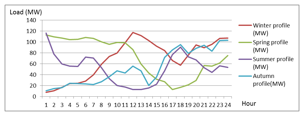 The decision on which units to run is highly dependent on the daily load profile. While three seasons (winter, spring, and autumn) saw the load peak after sunset (Figure 4), the summer peak occurred at midday, followed by a slower decline. This marked seasonal difference in load patterns complicates the operator’s task, primarily because of the financial and technical burden of cycling units, including startup, shutdown, and fuel marginal costs.