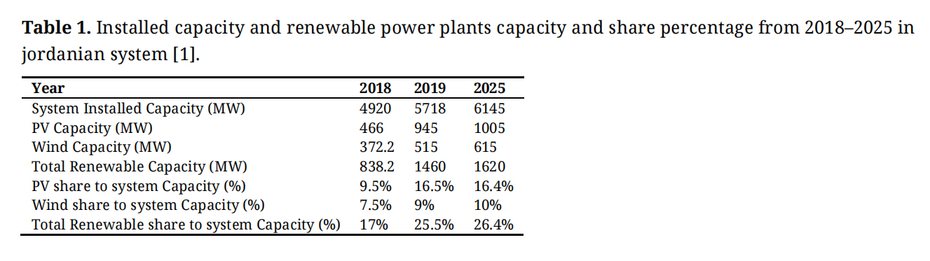 Table 1. Installed capacity and renewable power plants capacity and share percentage from 2018–2025 in jordanian system [1].