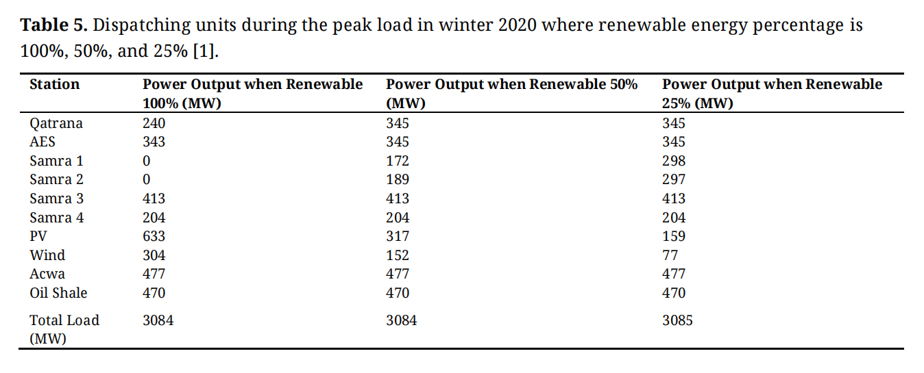 Table 5. Dispatching units during the peak load in winter 2020 where renewable energy percentage is 100%, 50%, and 25% [1].