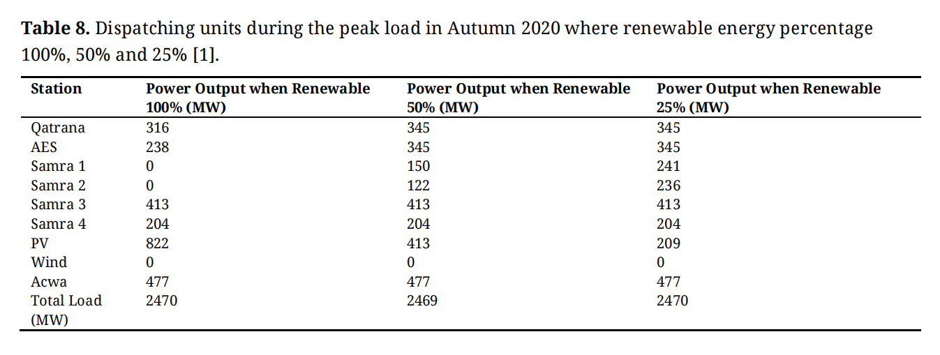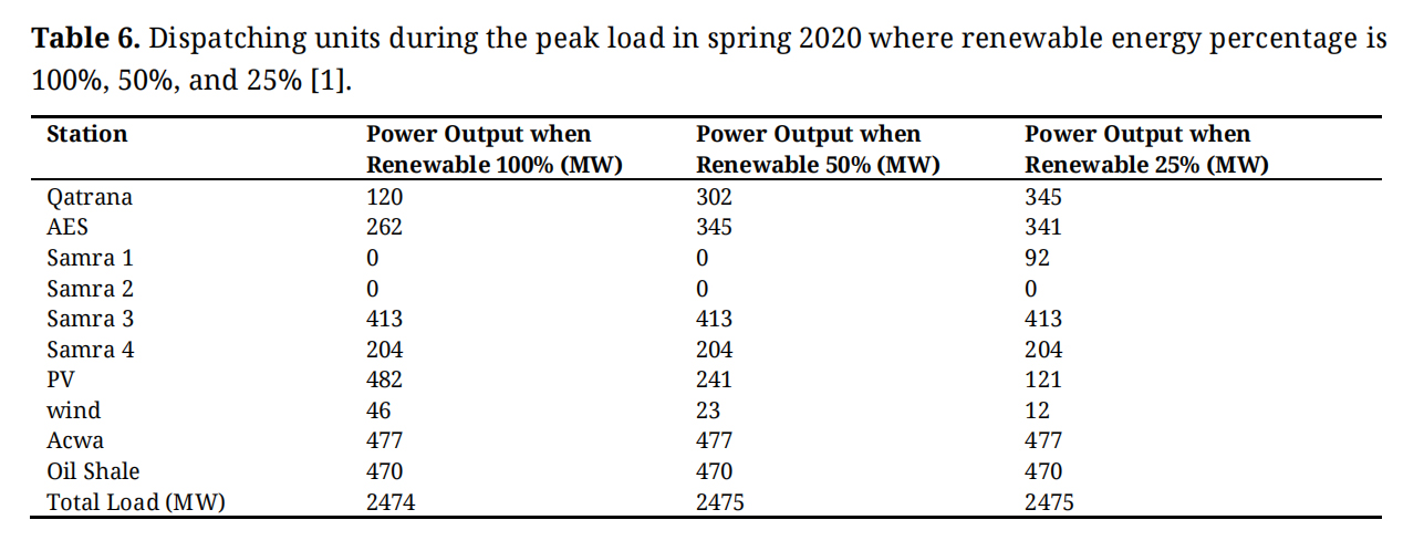 Table 7. Dispatching units during the peak load in Summer 2020 where renewable energy percentage is 100%, 50%, and 25% [1].