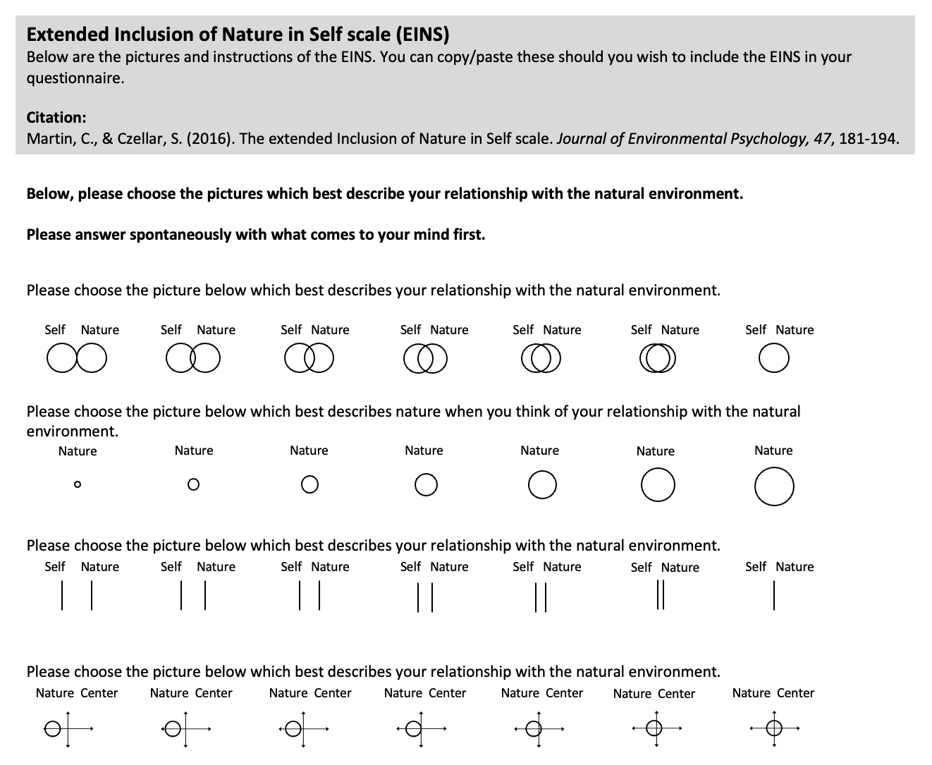 The INS scale is particularly practical for use with children and adolescents due to its simplicity and visual format. It measures perceived overlap between self and nature, reflecting how strongly individuals identify with the natural world. To improve the scale’s psychometric reliability, Martin and Czellar [28] developed the EINS scale, a four-item tool using spatial metaphors to capture self-nature overlap. Its accessibility makes it valuable in environmental education contexts, especially for younger participants, those with limited literacy, or people with cognitive disabilities.